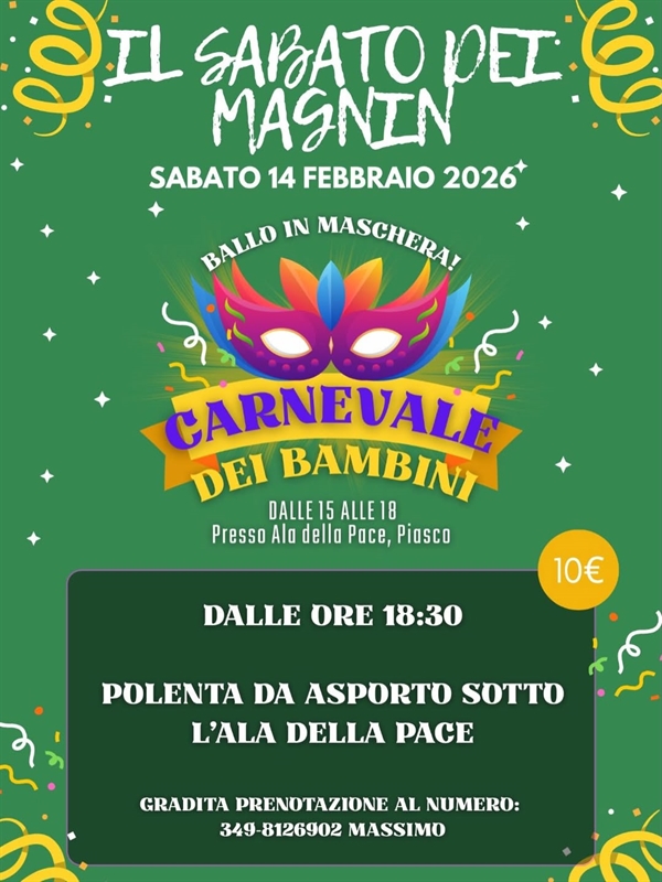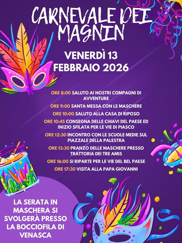 La festa continuerà in serata con la serata in maschera “in trasferta” presso la Bocciofila di Venasca, dove alle ore 20.00 si terrà la Cena dei Magnin.