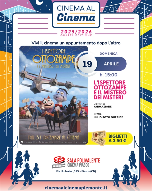 La Sala Polivalente “Dott. Serra” di Piasco è stata nuovamente selezionata per il 3° anno consecutivo per partecipare alla rassegna CinemaAlCinema – per Famiglie, un progetto promosso da AGIS Piemonte Valle d’Aosta e Regione Piemonte che sostiene e valorizza le sale cinematografiche del territorio, incoraggiando la partecipazione delle famiglie e dei più giovani.